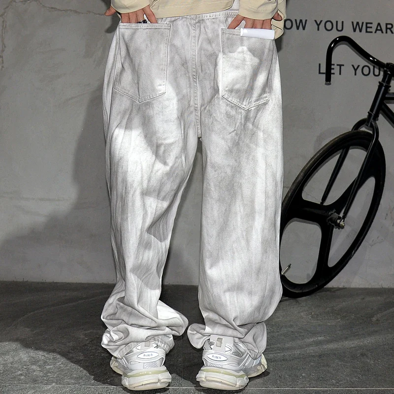 These jeans feature a relaxed baggy silhouette that captures the iconic Y2K streetwear vibe. The washed white denim gives a clean yet slightly worn grunge look, making them stand out while still staying versatile. The loose fit adds an effortless, laid-back feel that works well with modern fashion trends.
